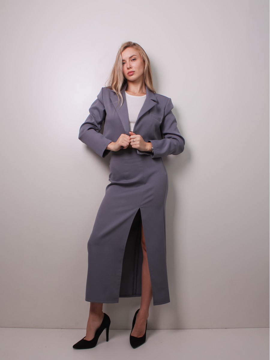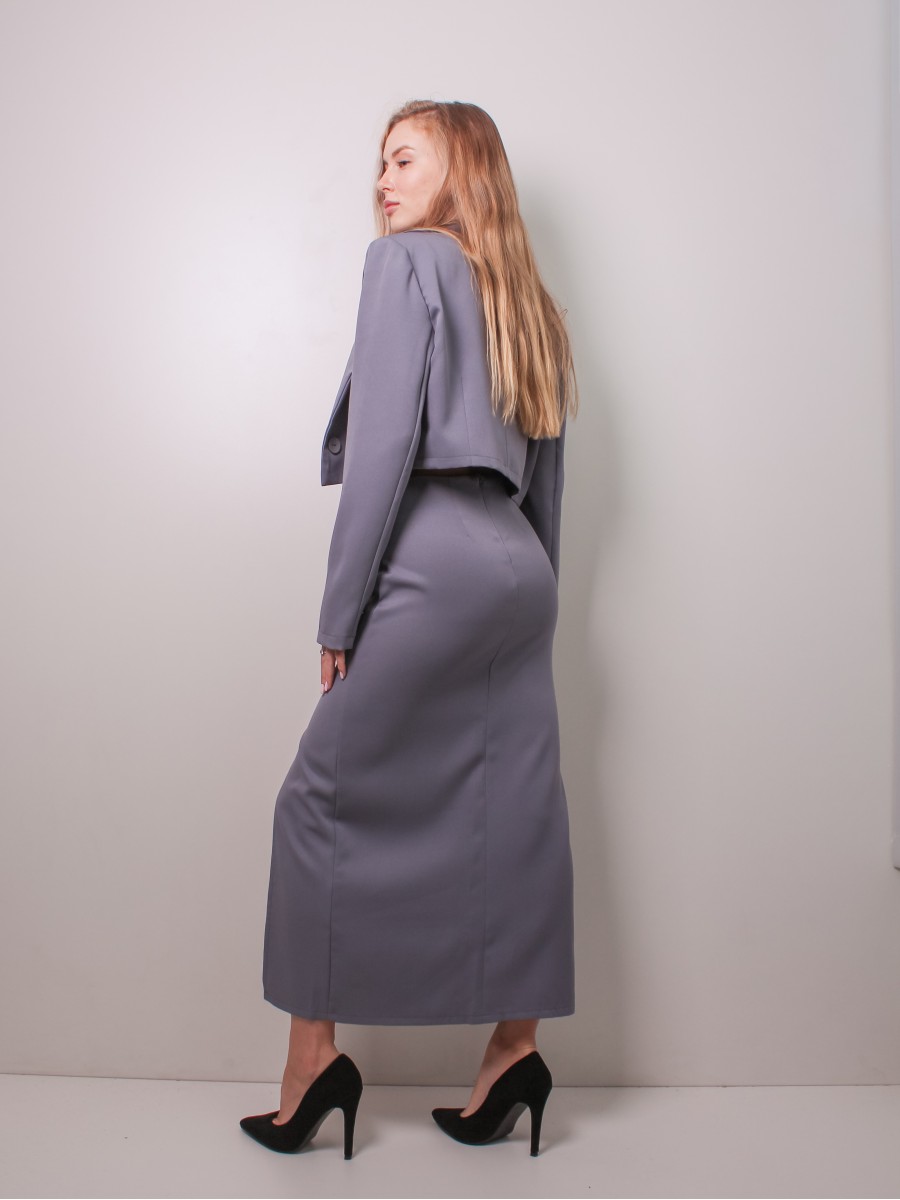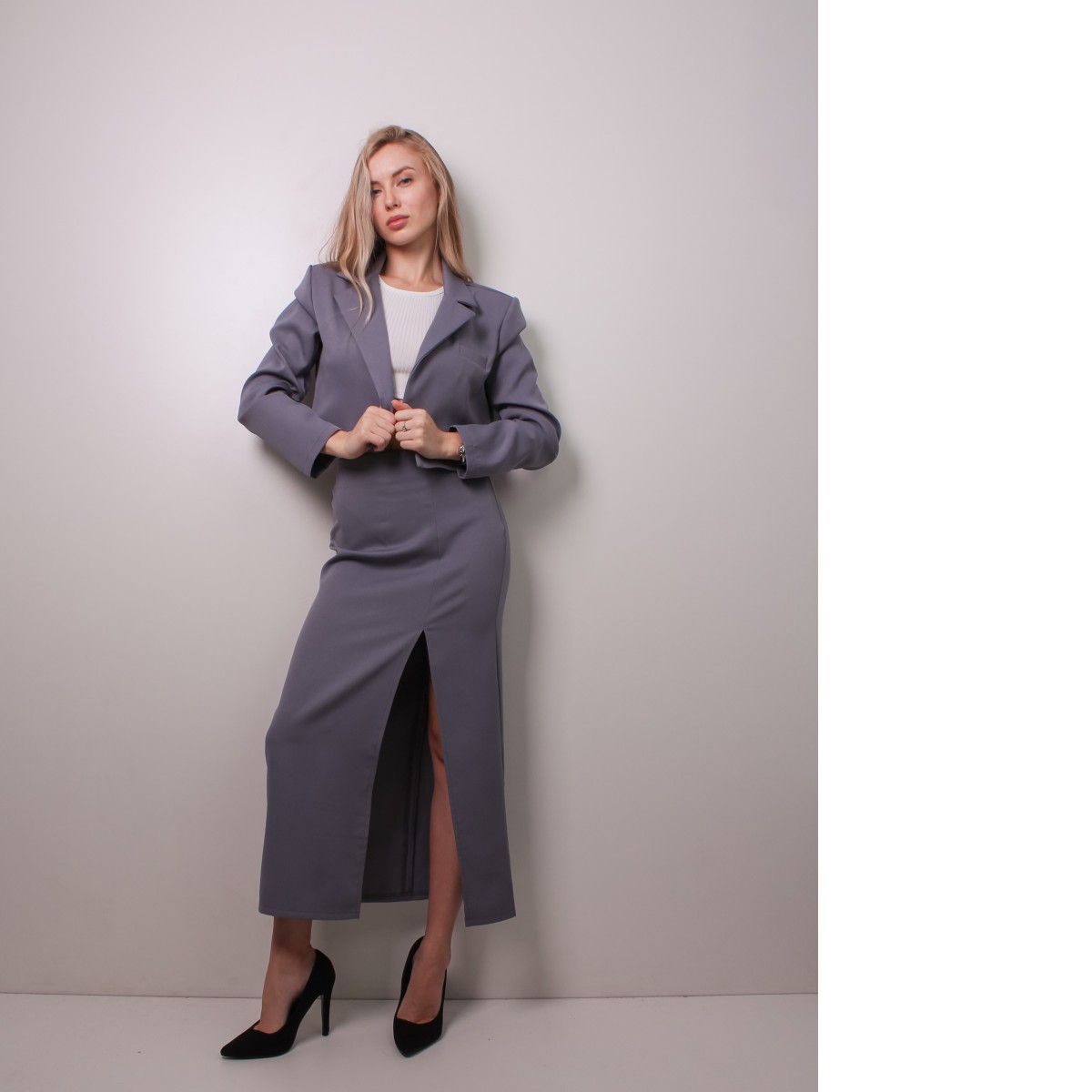 Вона має стриманий силует, добре тримає форму та підходить як для офісних, так і для повсякденних образів. Завдяки щільній костюмній тканині виглядає структуровано й витончено.
