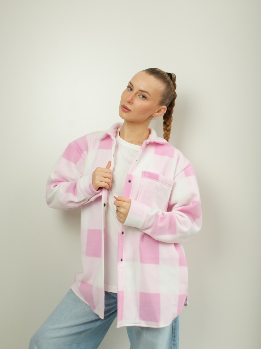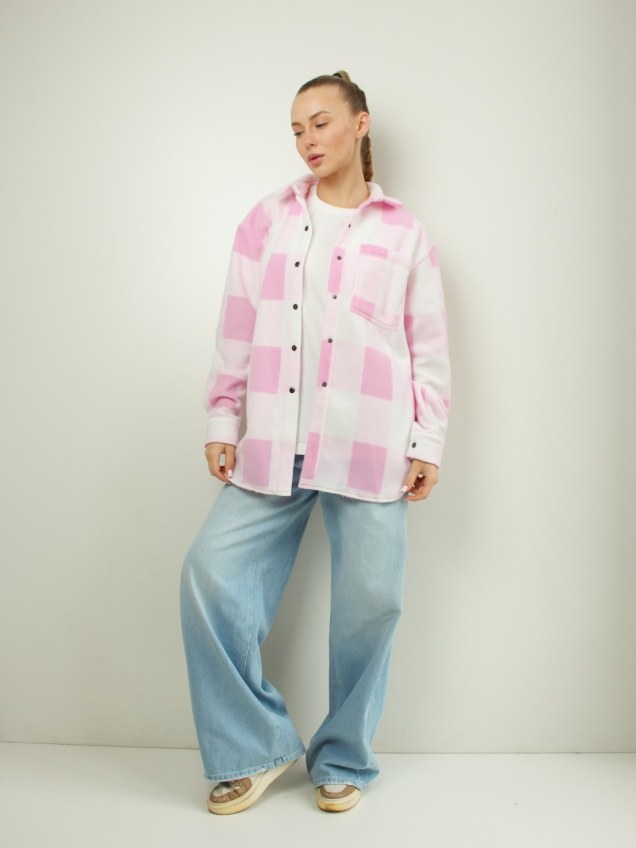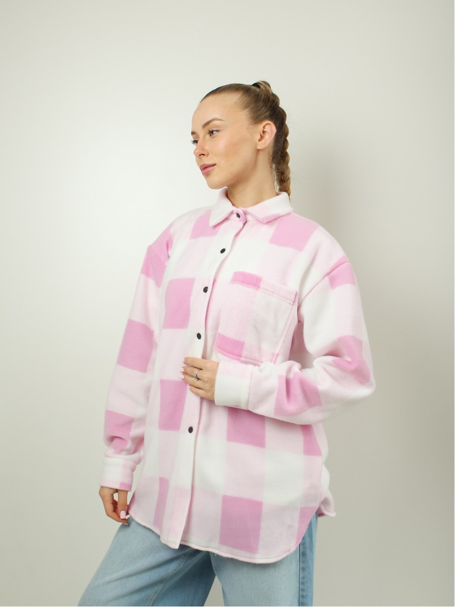 Рубашка в клітинку на флісі жіноча рожево-білий 10192